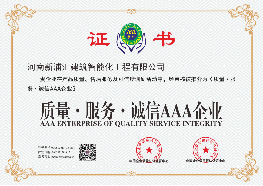 2020年12月,中國(guó)企業(yè)質(zhì)量認(rèn)證監(jiān)督中心、中國(guó)企業(yè)信用評(píng)估認(rèn)證中心對(duì)河南新浦匯資本實(shí)力、運(yùn)營(yíng)能力、管理水平、客戶(hù)信用、質(zhì)量體系、售后服務(wù)、發(fā)展前景等方面的信用狀況以及信用能力進(jìn)行了綜合評(píng)審后,授予新浦匯“質(zhì)量 · 服務(wù) · 誠(chéng)信 AAA企業(yè)”稱(chēng)號(hào)。